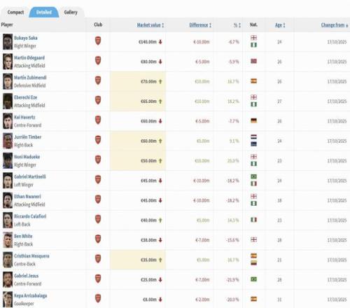 阿森纳球员身价变更:萨卡跌至1.4亿欧,厄德高下跌500万欧