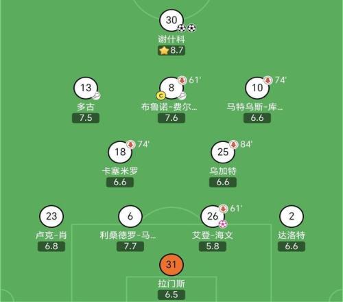 此战是临时主帅弗莱彻的曼联执教首战,一改阿莫林此前的三后卫,改用4231阵型。 谢什科突前,身后是多古、B费和库尼亚,卡塞米罗和乌加特搭档双后腰。