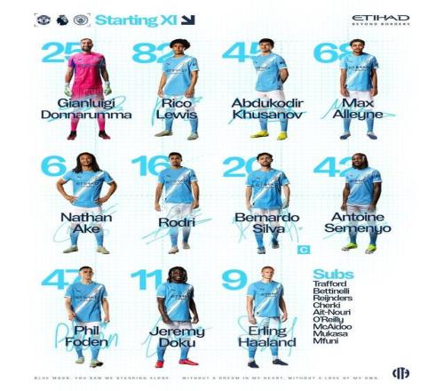 曼联首发:31-拉门斯、2-达洛特、5-马奎尔、6-利桑德罗-马丁内斯、8-布鲁诺-费尔南德斯、13-多古、16-阿马德-迪亚洛、18-卡塞米罗、19-姆伯莫、23-卢克-肖、37-梅努 替补:1-巴因迪尔、26-海文、12-马拉西亚、15-约罗、7-芒特、25-乌加特、10-库尼亚、30谢什科、38-杰克-弗莱彻 曼城首发:25-多纳鲁马、68-阿莱恩、45-胡桑诺夫、82-里科-刘易斯、6-阿克、47-福登、16-罗德里、20-伯纳多-席尔瓦、11-多库、42-塞门约、9-哈兰德 替补:1-特拉福德、4-赖因德斯、10-谢尔基、13-贝蒂内利、21-艾特-努里、33-尼科-奥赖利、56-麦卡杜、63-穆卡萨、91-姆富尼